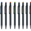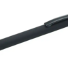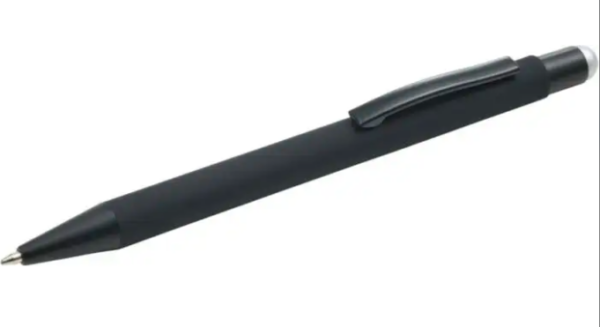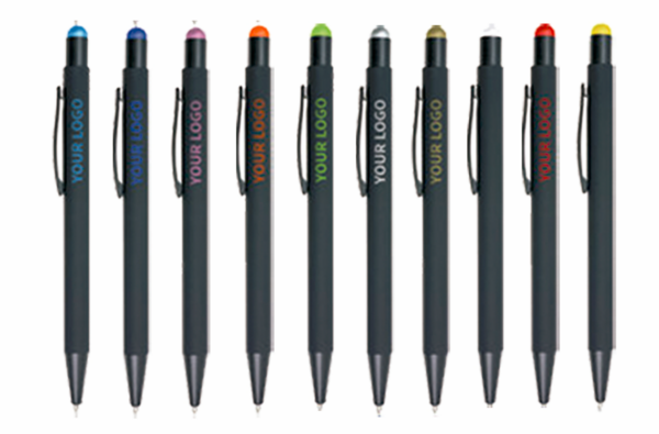 Bolígrafo de aluminio recubierto de caucho negro y con puntero táctil. Cuando se graba el cuerpo del bolígrafo a láser, el logo aparece colorido, brillante, metalizado y del mismo color que el puntero. Tinta azul.