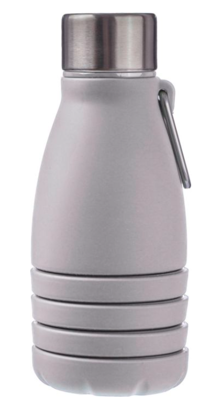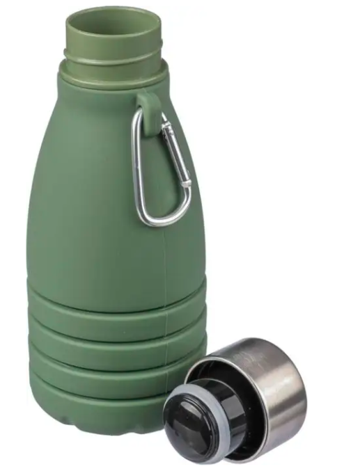 Botella plegable de silicona (550 ml) con tapa de acero inoxidable y mosquetón de aluminio. Presentada a granel. Evitar bebidas ácidas o con gas.