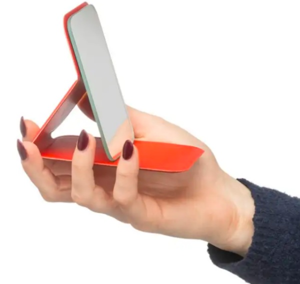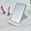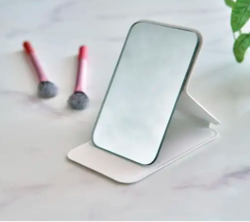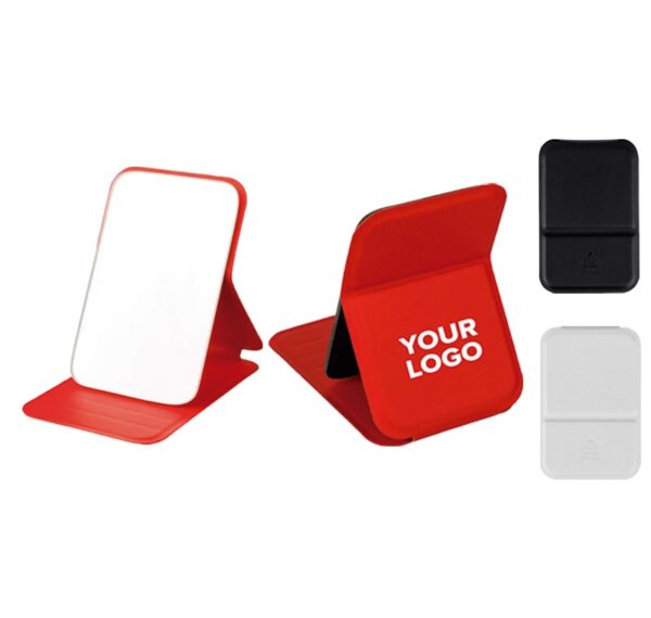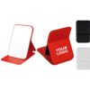 Espejo de cristal con tapa plegable de PU reciclado, diseñado para mantenerse de pie cuando está abierto. Tamaño de bolsillo 70 x 11 cm, disponible en negro, blanco y rojo. Logotipo de reciclado estampado en relieve. Presentación en bolsa de papel.