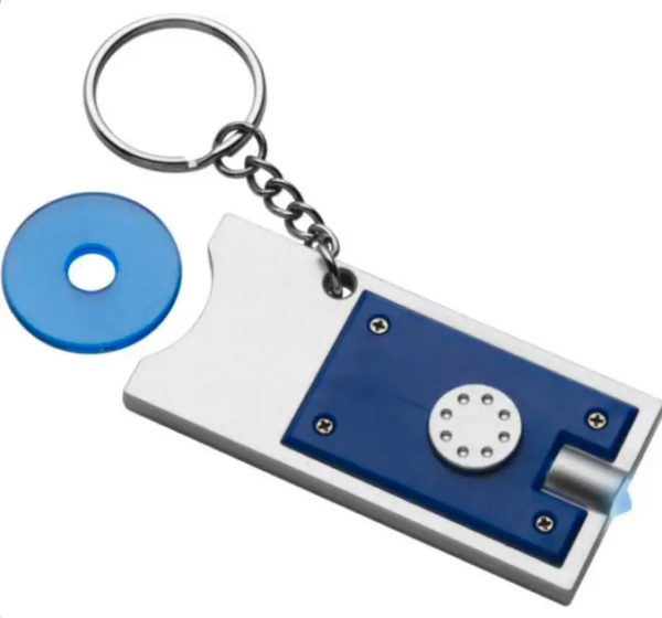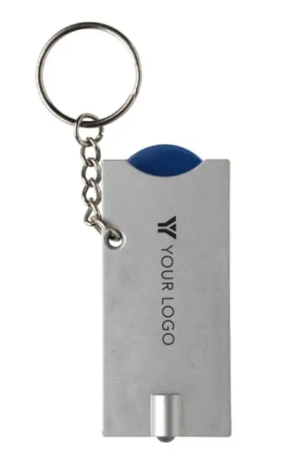 Llavero de PS con linterna LED y moneda de plástico de 50 céntimos.