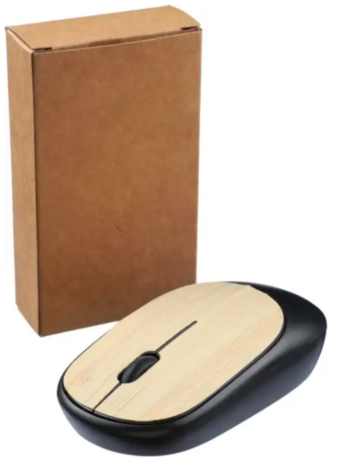 Ratón inalámbrico de ABS con detalles de bambú. Incluye batería. 2,4 GHz con receptor USB y 1.200 DPI. Presentado en una caja de cartón marrón.