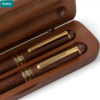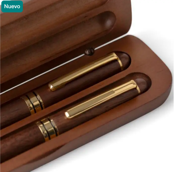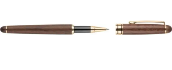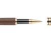 Set de escritura de madera de nogal y latón que consta de un bolígrafo giratorio con punta de metal, clip y adornos, y un roller. Ambos tienen tinta azul Dokumental alemana. Con el bolígrafo giratorio se puede escribir hasta unos 1000 metros y con el roller hasta 400 metros. Presentación en un estuche de madera de arce y una caja de cartón marrón. Tinta azul.